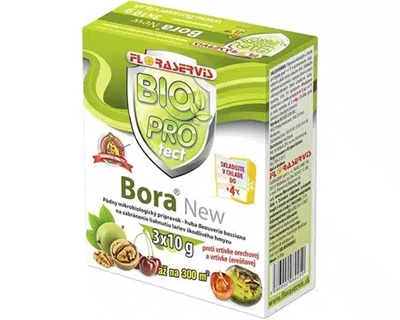Pôdny mikrobiologický prípravok – huba Beauveria bassiana na zabránenie liahnutiu lariev škodlivého hmyzu- aj proti vrtivke orechovej a čerešňovej.Mikrobiologický prípravok, zmáčateľný prášok.Obsahuje prirodzene sa vyvýjajúce mikroorganizmy, ktoré sú prospešné pre vývoj rastlín, generujú vyššiu odolnosť voči patogénom a znečisteniu životného prostredia.Aplikácia na pôdu formou postreku alebo zálievky.Aplikačné zariadenie nesmie obsahovať žiadne zvyšky fungicídu!48 hodín pred aplikáciou nechať prípravok rozmočiť vo vode (t.z. postrek pripraviť 48 hodín pred aplikáciou)!!!VRTIVKA ORECHOVÁTermíny aplikácie prípravku BORA proti vrtivke orechovej vychádzajú zo spôsobu života škodcu.Vrtivka orechová prezimuje v štádiu kukiel plytko v pôde a za rok má jednu generáciu.Rojenie dospelých múch a kladenie vajíčok do oplodia orechov prebieha od začiatku júla až do septembra (môže sa sledovať pomocou žltých lepových dosiek, zavesených do korún stromov v poslednej dekáde júna).Vyliahnuté larvy sa živia oplodím.Vyvinuté larvy opúšťajú plody, padajú na zem, zavŕtajú sa plytko do pôdy a zakuklia sa.Spóry huby v biologickom prípravku BORA môžu zničiť vysoké percento kukiel a tým znížiť počet vyliahnutých dospelých múch vrtivky orechovej.1. aplikácia - polovica júnaRozriedený prípravok BORA treba aplikovať na povrch pôdy vo forme zálievky alebo výdatného postreku a pôdu treba udržiavať stále vo vlhkom stave.Niekoľko dní po aplikácii prípravku sa môže pôda zakryť bielou alebo čiernou textíliou, ktorá zadrží zbytok vyliahnutých múch vrtivky pod krytom.Podmienkou však je, aby okraje textílie boli zapustené do zeme a stred dôkladne pripevnený ku kmeňu chráneného stromu.Zakrytá plocha by mala mierne presahovať hranice obvodu koruny.2. aplikácia - posledná dekáda júlaRozriedený prípravok BORA treba aplikovať vo forme zálievky alebo výdatného postreku na povrch pôdy alebo na textíliu, ktorá bola položená už v júni.Koncom júla alebo začiatkom augusta možno očakávať dospievanie prvých lariev, ktoré vypadávajú z poškodeného oplodia orechov.Prípravok BORA možno aplikovať ešte dvakrát s dvojtýždňovým odstupom.VRTIVKA ČEREŠŇOVÁPodobne ako proti vrtivke orechovej sa prípravok BORA môže aplikovať aj proti vrtivke čerešňovej, ktorj rojenie prebieha v máji.Preto prvá aplikácia prípravku BORA je aktuálna už v polovici apríla, druhá v čase dozrievania poloneskorých a neskorých odrôd čerešní a višní.Všetky ostatné opísané opatrenia sú zhodné s odporúčaniami proti vrtivke orechovej.Používajte prípravok na ochranu rastlín bezpečným spôsobom. Pred použitím si vždy prečítajte etiketu a informácie o prípravku.Pre zachovanie trvanlivosti až 2 roky a uchovanie vysokej účinnosti, je nutné dlhodobo skladovať prípravok Bora New v chlade pri teplote 0 až 4°C.V prípade ak sa pre prípravok vyžaduje Karta bezpečnostných údajov (klasifikácia a označenie prípadných rizík a nebezpečenstva a iné) nájdete ju v zozname po kliknutí na tento odkaz.Rozsah registrácie prípravku v záhradníctvePlodina Škodlivý činiteľ Koncentrácia v % Dávka do 10l vody na 100m2 Čakacia lehota v dňoch záhradné plodiny larvy škodlivého hmyzu 5-10 g 0 dní orech vrtivka orechová 5-10 g 0 dní čerešne Vrtivka čerešňová 5-10 g 0 dní