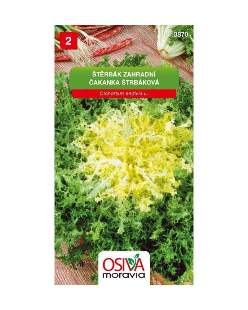 ČAKANKA ŠTRBÁKOVÁCichorium endivia L.Vytvára polouzavreté hlávky. Ružice sa pred zberom zväzujú alebo prihŕňajú, aby zbeleli. Konzumujú sa neprerastené ružice listov ako šalát, staršie ako špenát. Obsahuje fosfor, železo, draslík a vitamíny B1, B2 a PP.Kód 4844