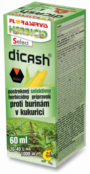Postrekový selektívny herbicídny prípravok proti dvojklíčnolistovým burinám v kukurici a v trávnikoch.Postrekový selektívny herbicíd vo forme kvapalného koncentrátu pre riedenie vodou určený proti dvojklíčnolistovým burinám v kukurici v dávke 6ml na 2-4 l vody na plochu 100 m2.Účinná látka: DICAMBA 480 g/lTúto účinnú látku obsahuje aj prípravok BANVEL, ktorý je registrovaný v ČR do trávnikov proti dvojklíčnolistovým burinám v dávke 3,75 ml na 2-4 L vody na 100 m2.Dicash je systémový herbicíd slúžiaci na postemergentnú (po vzídení kukurice) kontrolu (likvidáciu) dvojklíčnolistových burín v kukurici.Obsahuje účinnú látku dicamba, ktorá sa vstrebáva cez listy, výhonky a korene aktívne rastúcich rastlín.Negatívne ovplyvňuje fotosyntézu a bunkové delenie.Ihibuje rast, spôsobuje starnutie a rozpad tkaniva, s následným odumretím celej rastliny (buriny).Maximálny počet aplikácii v plodine: 1x za vegetačné obdobieAplikujte v kukurici postemergentne, od rastovej fázy tretieho listu, do rastovej fázy piateho listu kukurice, vo fáze 2-4 pravých listov dvojklíčnolistových burín.Používajte prípravok na ochranu rastlín bezpečným spôsobom. Pred použitím si vždy prečítajte etiketu a informácie o prípravku.V prípade ak sa pre prípravok vyžaduje Karta bezpečnostných údajov (klasifikácia a označenie prípadných rizík a nebezpečenstva a iné) nájdete ju v zozname po kliknutí na tento odkaz.Rozsah registrácie prípravku v záhradníctvePlodina Škodlivý činiteľ Koncentrácia v % Dávka do 2-4L vody na 100m2 Čakacia lehota v dňoch Povolené kombinácie a poznámkykukurica Dvojklíčnolistové buriny 6 ml AT POUŽITIE INDE AKO V SR trávniky Dvojklíčnolistové buriny 3,75 ml