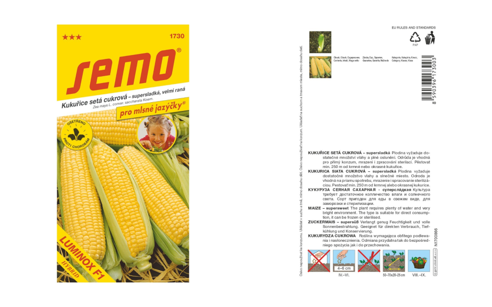 KUKURICA CUKROVÁ SUPERSLADKÁ F1Zea mays L. var. saccharata Koern.LUMINOX F1Veľmi skorý až skorý supersladký hybrid kukurice siatej cukrovej. Priemerný počet radov zŕn na vretene je 14 -16. Vynikajúca na mrazenie, konzervovanie a priamy konzum.Kód 1730