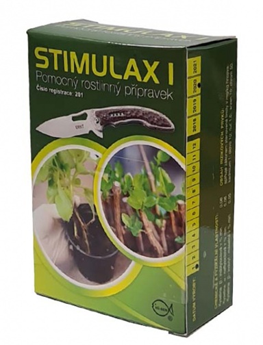 Stimulax I práškový je určený na kvalitné zakorenenie a rýchlu tvorbu koreňovej sústavy bylinných a drevitých odrezkov. Účinné látky: kyselina indolyloctová 0,06 %, kyselina alfa-naftyloctová 0,06 %, kyselina naftyl-maslová 0,05 %.Použitie: Odrezky určené pre zakorenenie – príprava:Na cca 2 až 3 cm odrezku odstránime listy a túto časť namočíme do vody. Nad substrátom určeným na rezkovanie namočené časti odrezkov posypte práškovým stimulaxom. Takto pripravené odrezky zapichnite do substrátu. Substrát s odrezkami mierne utlačte. Substrát je nutné neustále držať v mierne vlhkom stave a polotieni. Neprevlhčujte. Na prvých 10 dní môžeme odrezky zakryť bielou netkanou textíliou. Dôležité pri množení odrezkami je správny termín zberu odrezkov. Odrezky by mali byť čerstvé, aby nepredýchali cukry, ktoré obsahujú ich pletivá. Tie sú dôležité pri vytváraní kalusov a následne korienkov.